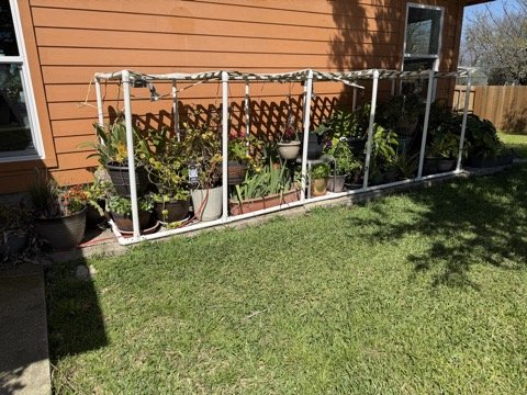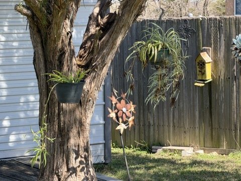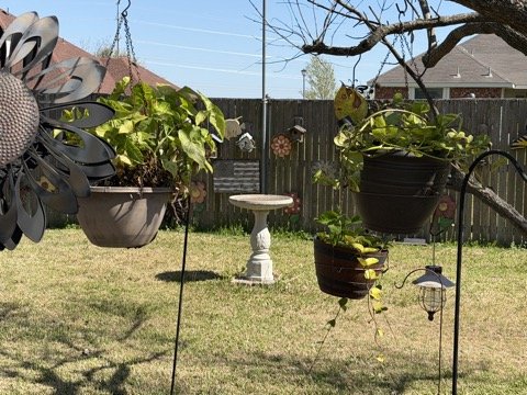 Got some of the Ivy plants hung up in the shady areas so the 90° sunshine doesn't burn them. Spring will cool off next week!